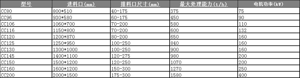 CC 系列颚式破碎机可以对坚硬、强磨蚀性 的各种矿石和岩石进行的粗碎和中碎。它拥有可 拆装无焊接结构机架、优化腔型结构、双楔块调 整装置、精选的原材料和元器件、弹性限位减震 装置、 一体化电机座等特别设计,破碎效率高、 投资成本低、使用寿命长、运行稳定。